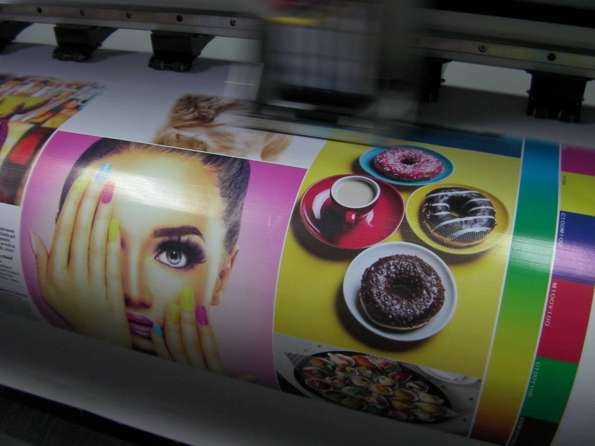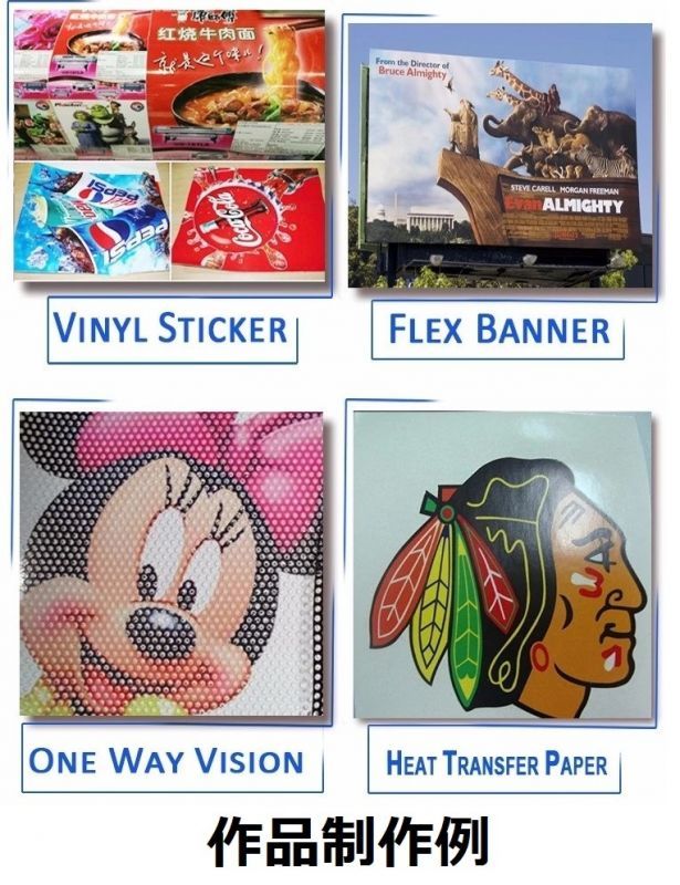 パソコンでデザインした画像や写真、ロゴなどをビニール、テント生地などに直接プリントできます。エコソルベントインクはビニール素材にも吸着が良く、乾いたらすぐに施工ができます。看板、電照看板 捨看板 イベント用壁紙、などビニール素材 カーラッピングフィルム印刷などができます。